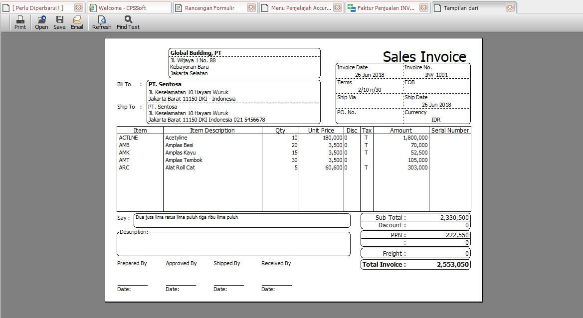 Namun, jika kita ingin membuat form seperti form yang sudah dimiliki oleh perusahaan, tentunya hal ini memerlukan perhatian khusus karena banyak yang perlu kita desainkan dan diubah agar dapat mengikuti format form yang ada. Untuk itu kami dapat membantu Anda dalam mendesainkan form ACCURATE Accounting agar sesuai dengan kebutuhan perusahaan. Kami dapat mendesainkan segala jenis form yang ada di ACCURATE untuk dapat mengikuti format yang ada, baik itu dari segi ukuran maupun informasi yang ada. Anda hanya perlu mengirimkan contoh tampilan form yang ingin didesainkan.