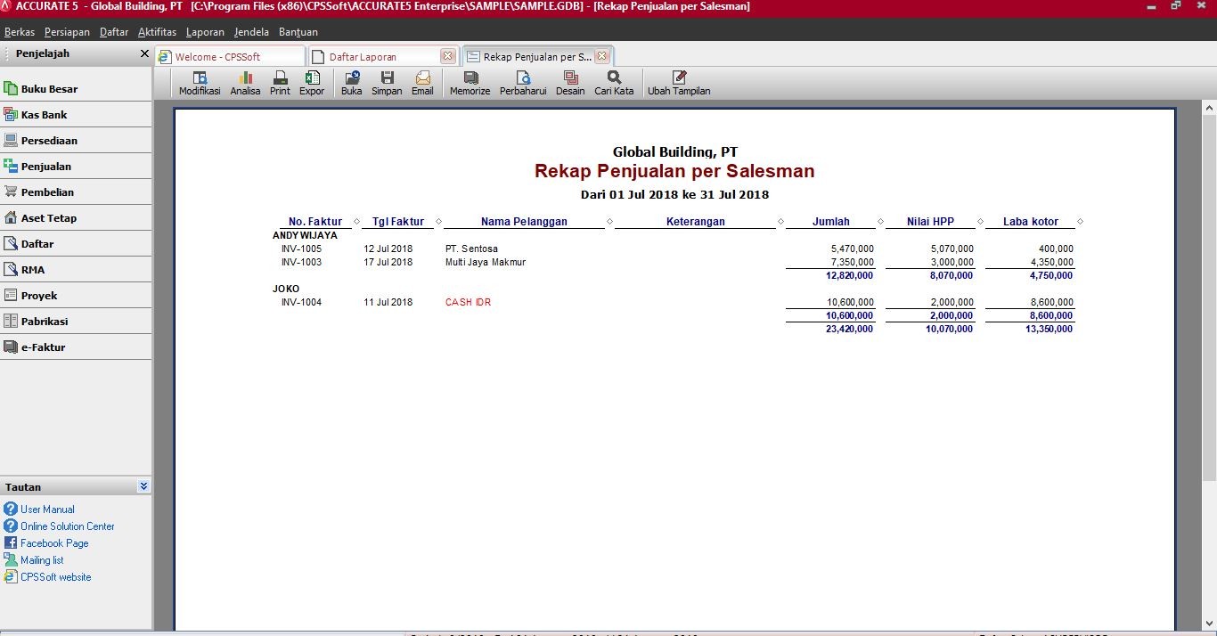 Dari sini Anda dapat membuka laporan apa yang ingin dicetak dari kategori laporan, lalu tinggal buka detail laporan yang ingin dicetak. Namun, kadangkala ada beberapa laporan yang memang belum ada secara standard di ACCURATE, sebut saja seperti laporan omset per Salesman ataupun laporan Salesman per Pelanggan. Untuk itu kita perlu mendesain laporan yang ada sehingga dapat ditampilkan semua informasi yang dibutuhkan. Sebetulnya semua informasi yang kita butuhkan untuk ditampilkan sudah ada di ACCURATE, namun terkadang ada beberapa field yang perlu kita tampilkan ataupun modifikasi agar dapat ditampilkan laporan seperti yang kita butuhkan.