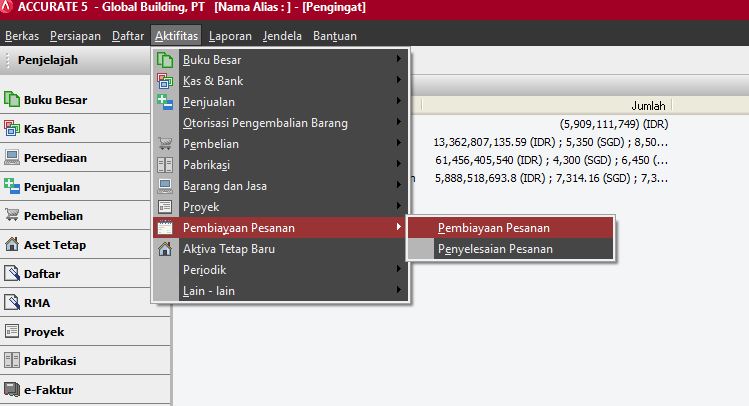 Menurut Wikipedia, Job Costing adalah proses pencatatan akuntansi utk pengeluaran dan pendapatan terhadap suatu pekerjaan. Sedangkan, di ACCURATE Module ini diperuntukkan untuk kita dapat memproduksi/merakit dari beberapa barang menjadi 1 barang baru. Selain itu, module ini juga dapat digunakan untuk memotong persediaan untuk proyek atau untuk dipakai sendiri. Untuk menginput module ini sangat mudah, klik menu Aktivitas/Activity | Pembiayaan Pesanan/Job Cost | Pembiayaan Pesanan/Job Costing.